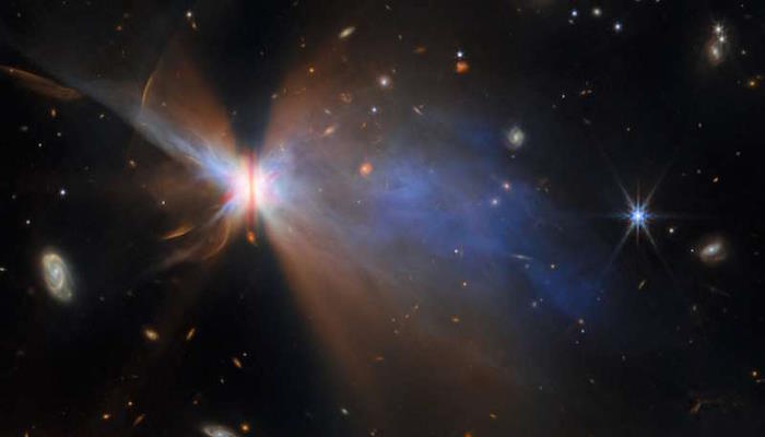 Уэбб показывает распределение крошечных пылинок, а также отражение ближнего инфракрасного света от пылевого материала, который простирается на большое расстояние от диска, в то время как Хаббл фокусируется на полосе пыли, а также на скоплениях и полосах, окружающих пыль, которые предполагают, что звезда все еще собирает массу из своего окружения. как выбрасывающие струи и оттоки.