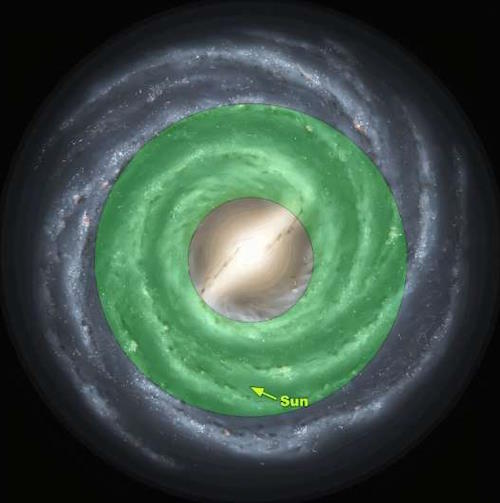 Как отмечается в этом исследовании, точный размер гигагерца все еще обсуждается, но научное сообщество сходится во мнении, что гигагерца в центре галактики не существует, поскольку в этом регионе происходят бесчисленные вспышки сверхновых и другие небесные явления, которые препятствовали бы образованию пригодных для жизни планет.