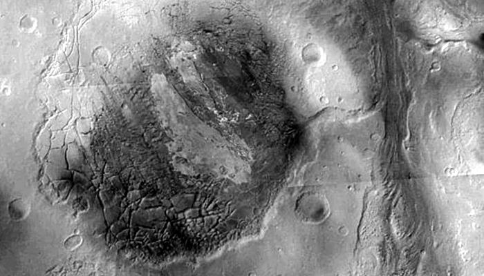 Как раз тогда на Красной планете сформировалась самая заметная особенность ее рельефа — гигантская система каньонов: они простираются вдоль марсианского экватора на 4,5 тысячи километров и местами достигают семикилометровой глубины, долины Маринера. Предположительно, эти разломы марсианской коры возникли от ее растяжения под напором двигавшейся под ней магмы.