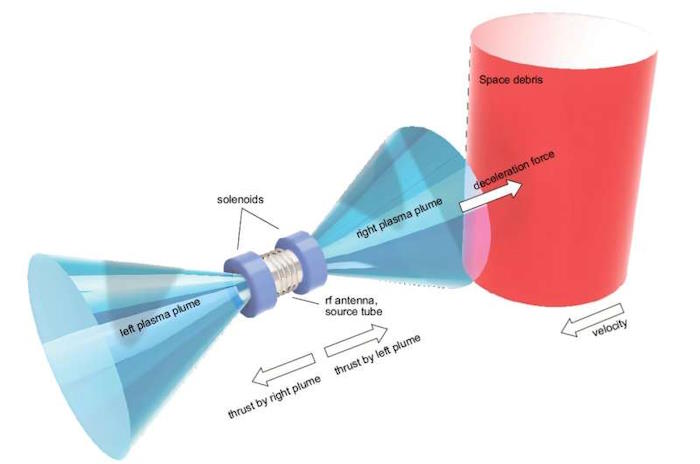 Идея заключается в том, что удалительный спутник, запущенный специально для удаления космического мусора, мог бы использовать двигательный двигатель для выброса плазмы в сторону куска космического мусора. Сила плазмы замедлила бы мусор настолько, что он сошел бы с орбиты — процесс, который занимает около 100 дней. Проблема в том, что сила плазмы, испускаемой удаляемым спутником, оказывает сильное обратное воздействие, удаляя спутник от цели и уменьшая эффект замедления.