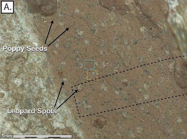 Эти особенности, получившие название "маковые зернышки" и "леопардовые пятна", были обнаружены на грязеподобных скалах в долине Неретва, которые марсоход исследовал с момента высадки на Марс.