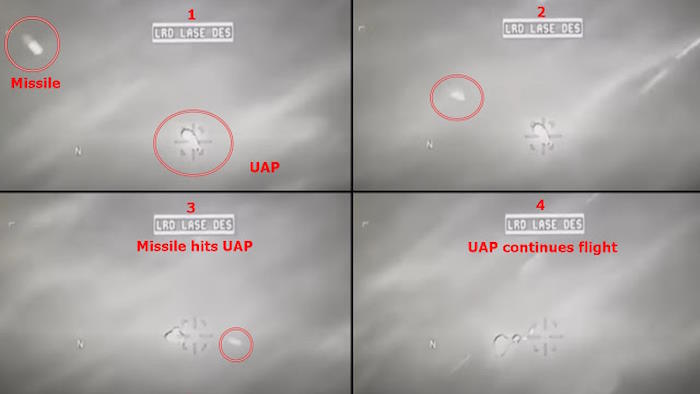 На зернистом черно-белом видео видно, как 100-килограммовое высокоточное оружие летит к цели, но рикошетом отскакивает от нее, не причиняя вреда, когда объект улетает с невероятной скоростью. Не менее загадочным было то, что три сферы меньшего размера зависли в воздухе вокруг аппарата, не пострадав от удара.