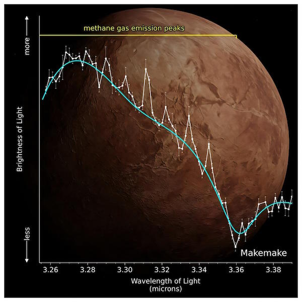 "Макемаке - один из крупнейших и ярчайших ледяных миров за пределами Нептуна, и на его поверхности преобладает замерзший метан", - говорит доктор Сильвия Протопапа из SwRI, ведущий автор новой статьи, которая вскоре будет опубликована в Astrophysical Journal Letters.