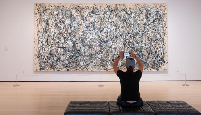 Именно там до сих пор находится картина Поллока "Номер 1А" 1948 года, известная своими размерами, выразительностью и цветом, с отпечатками рук самого художника в верхней части холста.