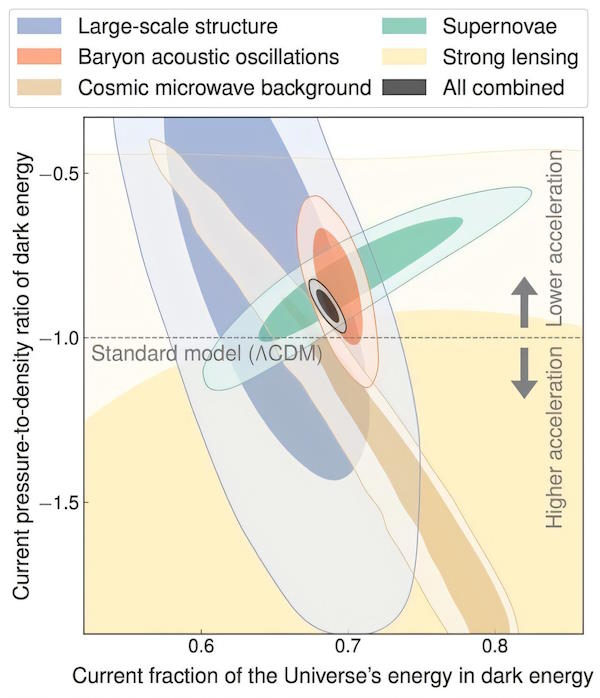 Однако в прошлом году интерес к эволюции темной энергии резко возрос благодаря сочетанию данных о вспышках сверхновых, акустических колебаниях барионов и фоновом космическом микроволновом излучении, полученных в рамках исследования темной энергии, спектроскопического прибора темной энергии и экспериментов Планка. Эта комбинация наборов данных указывала на сильное расхождение со стандартной, неэволюционирующей моделью темной энергии.