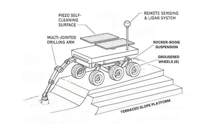Последней задачей в работе было спроектировать марсоход, который действительно будет заниматься добычей полезных ископаемых. Разработанный ими проект весил около 2,1 тонны и был похож на Perseverance, с шестью колесами, постоянно поддерживающими контакт с землей. Он будет оснащен роботизированной рукой и будет питаться от радиоизотопного теплового генератора, аналогичного существующим моделям марсоходов. Однако он также будет оснащен солнечными батареями с функцией самоочищающейся вибрации, чтобы пыль не оседала на них в течение длительного времени.