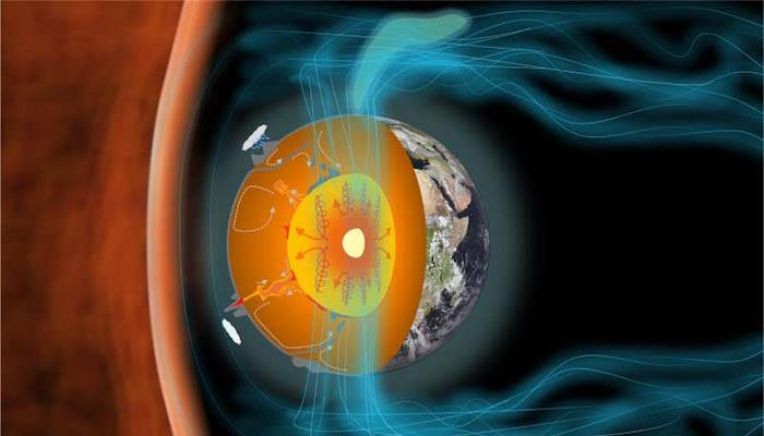 Это же охлаждение также генерирует магнитное поле Земли. Большая часть энергии этого поля сегодня поступает от замораживания жидкой части ядра и роста твердого внутреннего ядра в его центре.