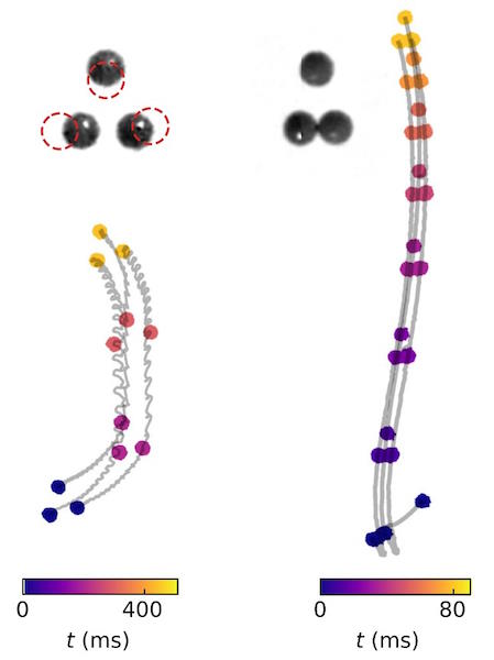 Сначала физики выстроили три частицы в виде равностороннего треугольника, а затем возбудили внутреннюю вибрацию системы параметрической накачкой для генерации несбалансированных сил, которые в свою очередь привели к глобальному перемещению всей структуры. В ходе эксперимента исследователи заметили, что наиболее выраженное движение произошло в том случае, когда первая и вторая частицы оказались близки друг к другу. Благодаря этому наблюдению ученые привели в столкновение эти две частицы, образовав димер, который совместно с третьей сферой начал движение по траектории в форме бабочки — такое поведение микрочастиц стало следствием невзаимных взаимодействий внутри системы.