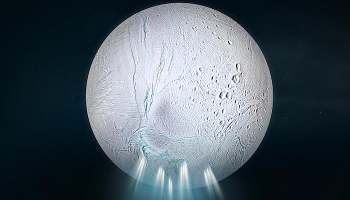 Струи воды, подобно гейзерам, вырываются из трещин вблизи Южного полюса, и хотя некоторые из них падают обратно на поверхность, другие вырываются наружу и образуют кольцо вокруг Сатурна, повторяющее орбиту Луны.