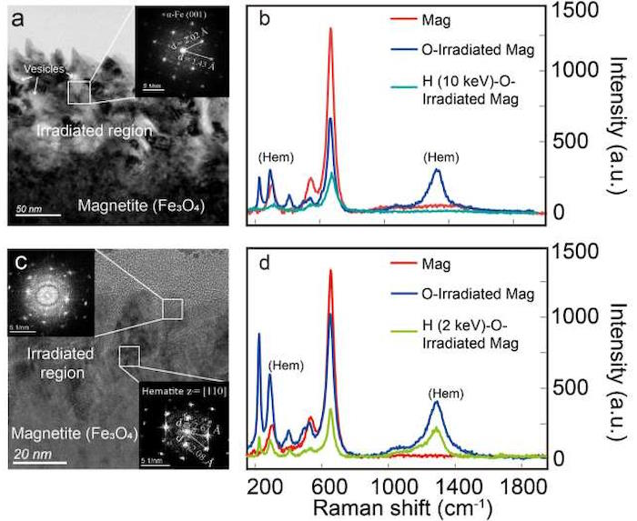 Исследователи также хотели определить, восстановят ли ионы водорода гематит обратно до металлического железа. Для этого они облучили гематит как высокоэнергетическим водородом, имитирующим водород, содержащийся в земном ветре, так и низкоэнергетическими ионами водорода, например, солнечными.