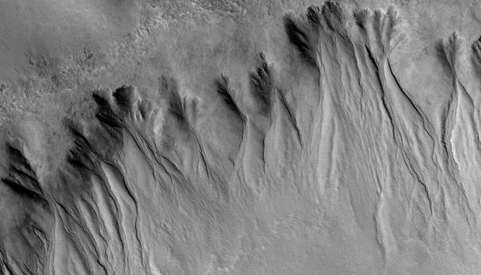Вдобавок на многих оврагах каждое марсианское лето возникают и постепенно удлиняются вертикальные темные полосы. Сохраняется вероятность того, что их создают стекающие потоки очень соленой воды. Впрочем, в последнее время более убедительной считают версию осыпания сухого песка и пыли.