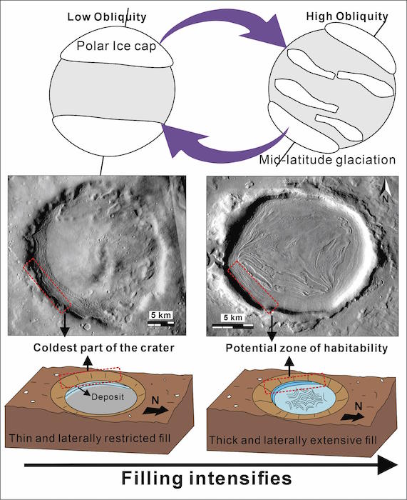 Чтобы выяснить это, исследователи проанализировали снимки высокого разрешения, полученные с орбитального аппарата Mars Reconnaissance Orbiter НАСА. Они сосредоточились на кратерах с характерными признаками оледенения, такими как горные хребты, морены (груды обломков, оставленных ледниками) и мозговой рельеф (изрытая, похожая на лабиринт поверхность, образованная богатыми льдом формами рельефа). Сравнив формы и ориентацию этих объектов с климатическими моделями, они обнаружили, что лед постоянно скапливается на более холодных, затененных юго-западных стенках кратеров. Эта тенденция сохранялась на протяжении различных ледниковых периодов, начиная примерно с 640-98 миллионов лет назад.
