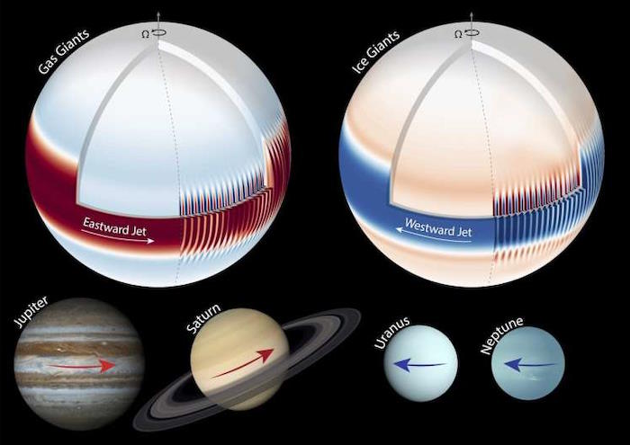 Особенно загадочным был тот факт, что на Юпитере и Сатурне ветры направлены на восток, в то время как на Уране и Нептуне они дуют на запад. Считается, что основные факторы, которые могут влиять на потоки на этих планетах, схожи. Планеты получают мало солнечного света, они имеют умеренный внутренний источник тепла и быстро вращаются. Неизвестны силы, которые могли бы объяснить разное направление ветров. До сих пор считалось, что разное направление реактивных ветров обусловлено различными механизмами, приводящими их в движение.