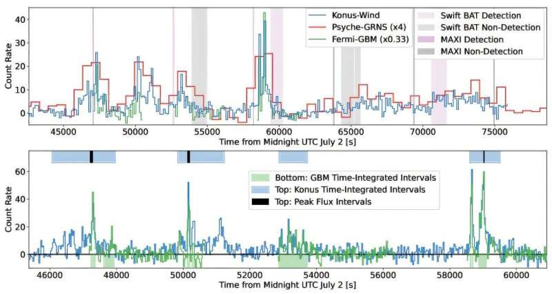 В новом препринте arXiv группа из более чем 50 ученых объединилась, чтобы выяснить, как, почему и откуда появился GRB 250702B. В своей статье команда проанализировала все доступные данные, объединив кривые блеска и спектральные данные, чтобы охарактеризовать продолжительность, изменчивость и энергетику события. Затем они рассмотрели различные возможные сценарии, которые могут привести к различным видам GRB-событий, чтобы определить, какой из них наилучшим образом соответствует сценарию, представленному GRB 250702B.