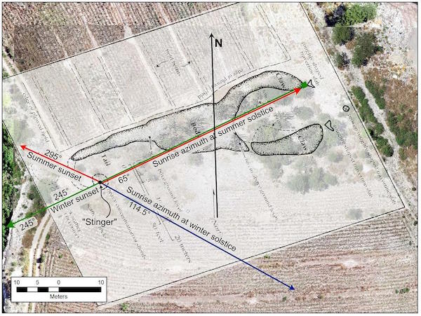 Ориентация кургана, по-видимому, была преднамеренной. Когда исследователи составили график его расположения, они обнаружили, что направление от “жала” к левому когтю составляет 65 градусов на восток-северо—восток - именно там, где восходит солнце во время летнего солнцестояния. И наоборот, во время зимнего солнцестояния закат совпадает с хвостом скорпиона, если смотреть с левой стороны.