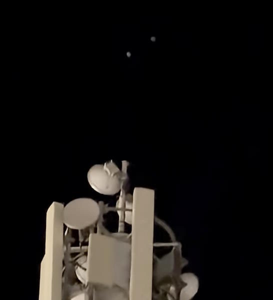 | Зацените этот редкий случай...Редкостью является то, что это два НЛО над Саудовской Аравией (Эль-Хофуф, Восточная провинция, Саудовская Аравия, 15 октября 2025 года). НЛО были замечены пролетающими мимо башни 5G и продолжающими двигаться. НЛО держатся на идеальном расстоянии друг от друга и следуют друг за другом. Похоже на пилота ВВС США, у которого есть ведомый, прикрывающий его спину. |