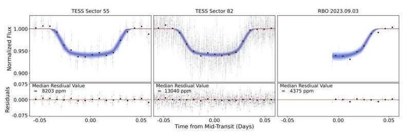 Теперь команда астрономов под руководством Шейна О'Брайена из Калифорнийского университета сообщает об обнаружении транзитных сигналов в кривых блеска двух М-карликов, а именно TOI-5916 и TOI-6158, которые примерно вдвое меньше Солнца по размеру и массе каждый. Команда О'Брайена подтвердила планетарную природу этих сигналов, используя наземную фотометрию и данные о лучевой скорости.