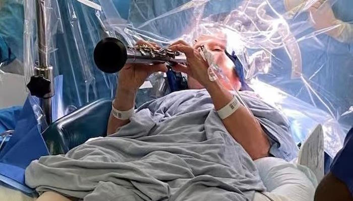 | Пациентка поступила в Больницу Лондонского королевского колледжа, чтобы ей установили электроды для глубокой стимуляции мозга по направляющим через небольшие отверстия в черепе. Бригада нейрохирургов под руководством Кеюмарса Ашкана (Keyoumars Ashkan) попросила ее во время операции под местной анестезией играть на любимом инструменте, чтобы точно локализовать оптимальное расположение электродов. |