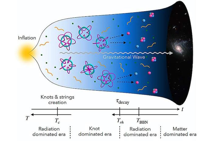 Их выводы, опубликованные в Physical Review Letters, предполагают, что эти "космические узлы" могли образоваться и на короткое время доминировать в турбулентной новорожденной Вселенной, коллапсируя таким образом, что материя преобладала над антивеществом, и оставляя после себя уникальный гул в пространстве—времени, который могли бы уловить будущие детекторы - редкость для загадки физики, которую, как известно, трудно разгадать. зонд.