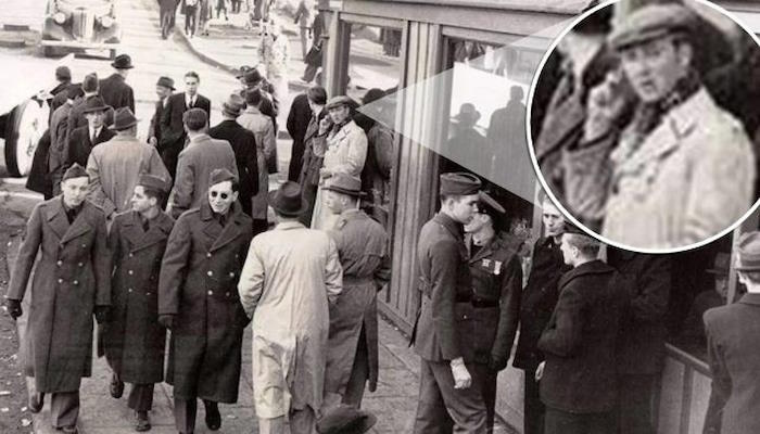 | Фотография 1943 года, на которой мужчина "разговаривает по мобильному телефону", разлетелась по социальным сетям. Журналисты выяснили, что эта фотография действительно была сделана в 1943 году в Рейкьявике, Исландия. На ней изображены американские солдаты, но этот человек в белом пальто определенно не является солдатом и явно отличается от других людей на фотографии. |