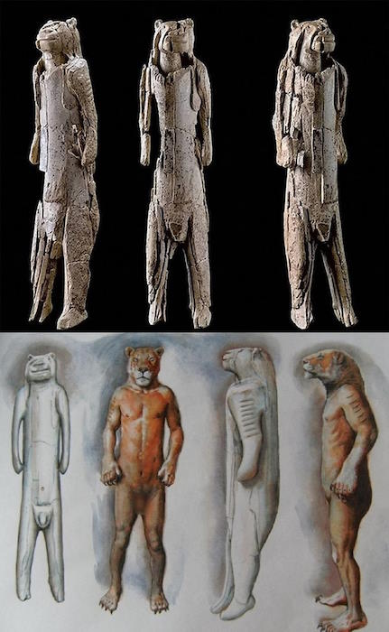 Рядом со скульптурой ученые предложили возможный «прототип», но вопрос остается: что на самом деле олицетворяет этот образ? Его облик напоминает египетских божеств с человеческими телами и звериными головами. Но есть одна озадачивающая деталь: первые подобные египетские изображения датируются примерно 5 000 лет назад. Эта же статуэтка старше на целых 30 000 лет.