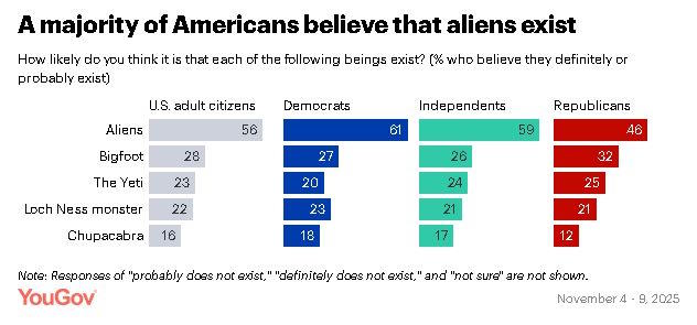 Демократы (61%) и независимые (59%) с большей вероятностью, чем республиканцы (46%), заявляют, что инопланетяне определенно или вероятно существуют, чего нельзя сказать о непроверенных формах жизни снежного человека и йети